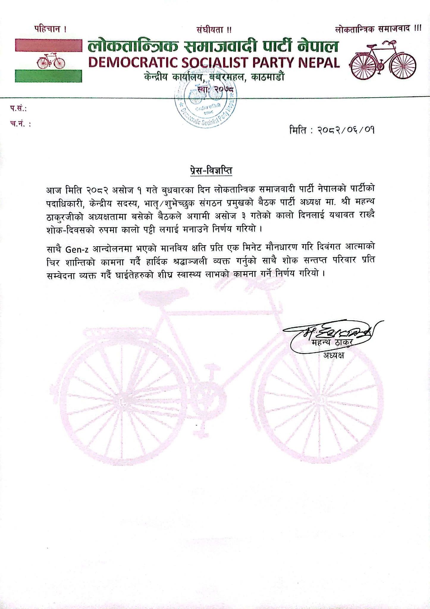 सो दिन पार्टीका नेता तथा कार्यकर्ताहरूले कालो पट्टी बाँधेर शोक दिवस मनाउने पनि निर्णय भएको छ। पार्टीले दिवंगत आत्माको चिर शान्ति तथा शोकसन्तप्त परिवारप्रति संवेदना व्यक्त गर्दै घाइतेहरूको शीघ्र स्वास्थ्य लाभको कामना गरेको छ।