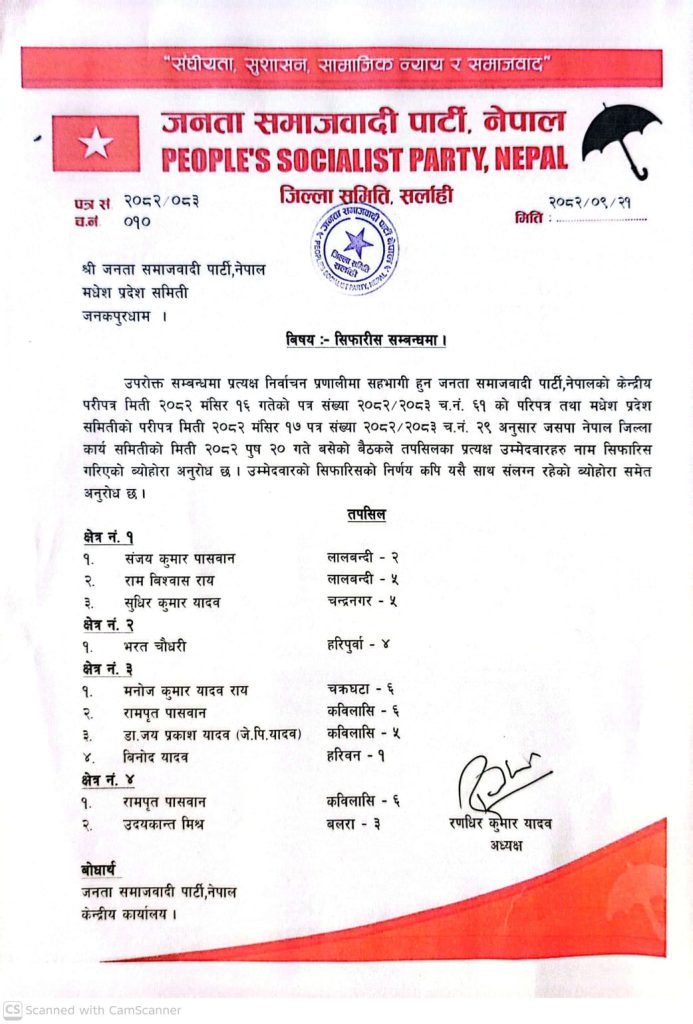 ‎जिल्ला समितिले सर्लाही निर्वाचन क्षेत्र नं. १ बाट संजय कुमार पासवान, राम विश्वास राय र सुधिर कुमार यादव, क्षेत्र नं. २ बाट भरत चौधरी तथा क्षेत्र नं. ४ बाट रामपृत पासवान र उदयकान्त मिश्रलाई प्रत्यक्ष उम्मेदवारका रूपमा सिफारिस गरेको जनाएको छ।